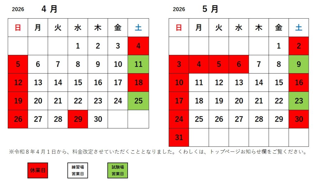 自動車練習場 営業日カレンダー